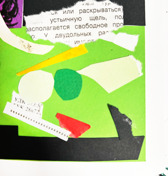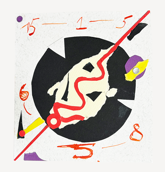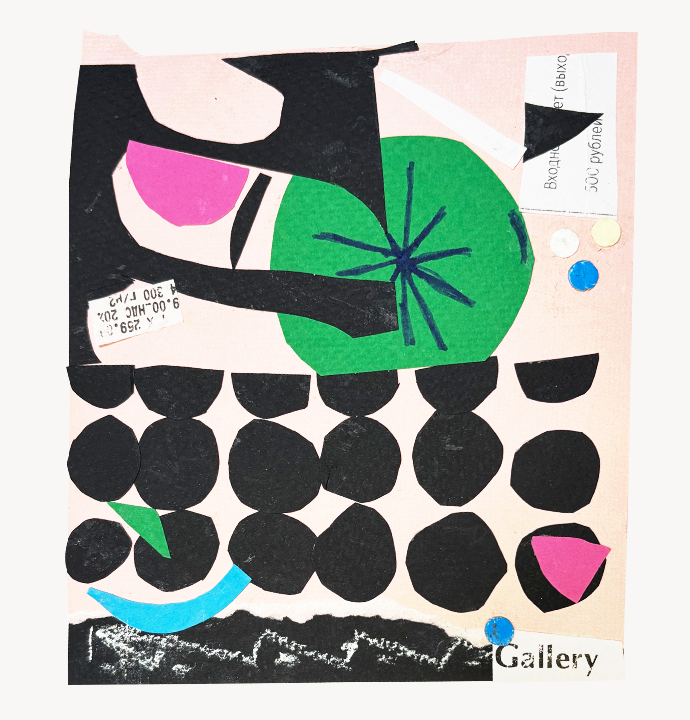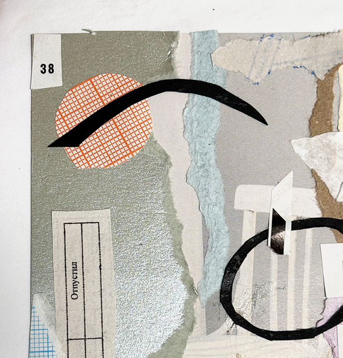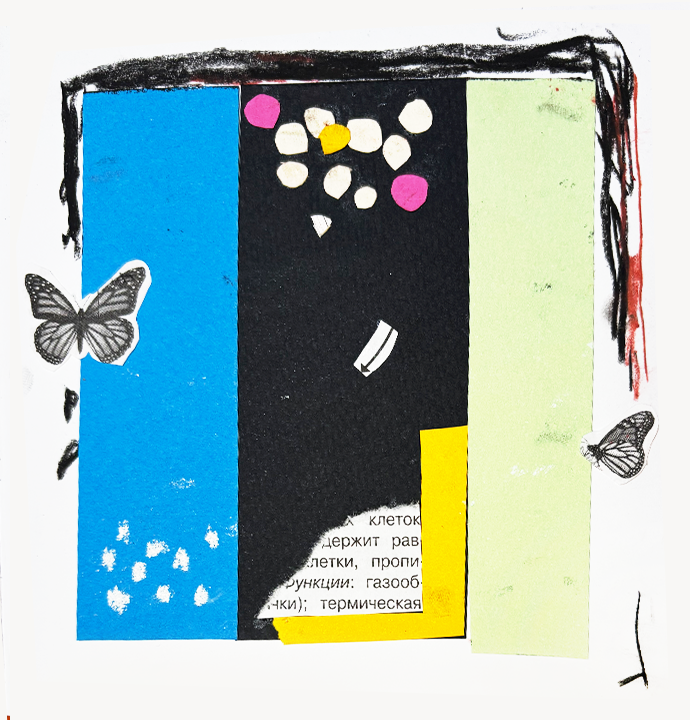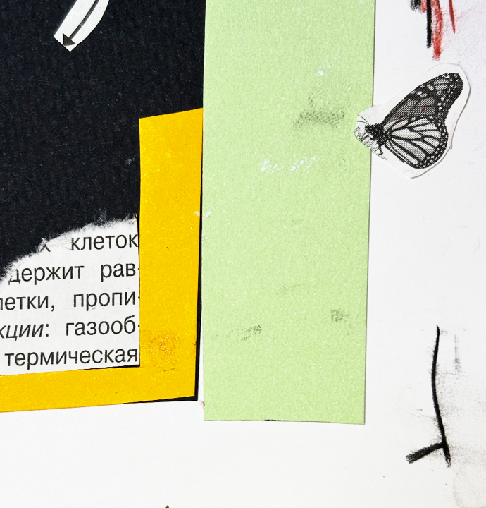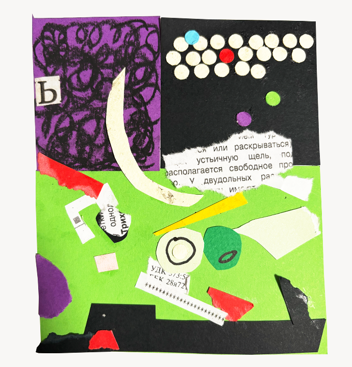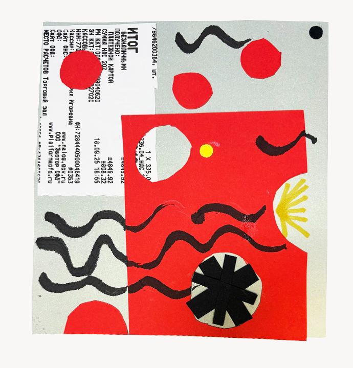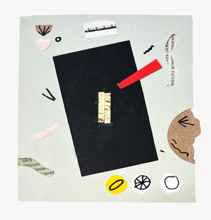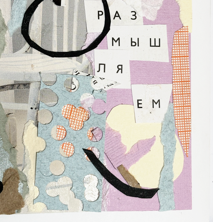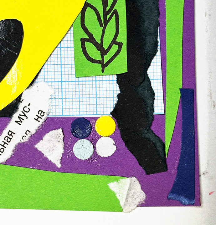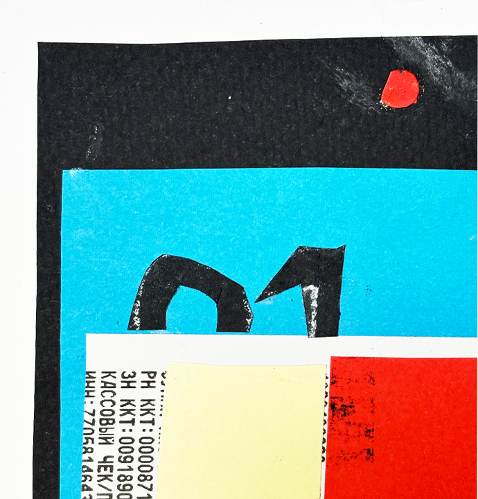 Бумага, мысль и неторопливое действие — так начинается работа. Скетчи фиксируют настроение и ритм, нащупывают форму и цвет. Перед аппликацией я настраиваюсь: слушаю эмоцию, выбираю силуэт и палитру. Под тихий хруст бумаги и рез ножниц примеряю решения, проверяю, как они держатся вместе. Из заготовок собираю композицию. Когда она устойчиво звучит — закрепляю клеем. Затем — финальные штрихи: маркер, пастель или чернила — то, что точнее подчёркивает характер. Останавливаюсь, когда форма и цвет входят в баланс.