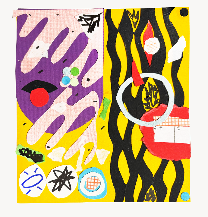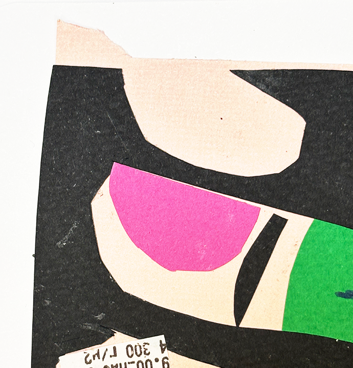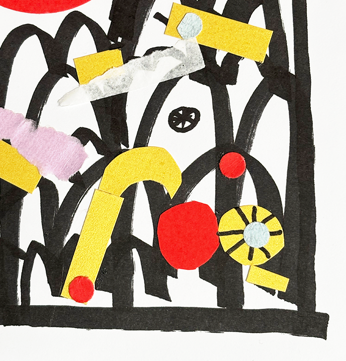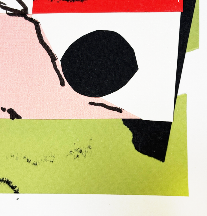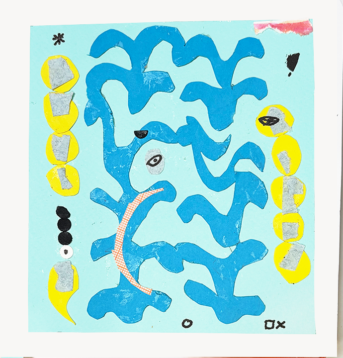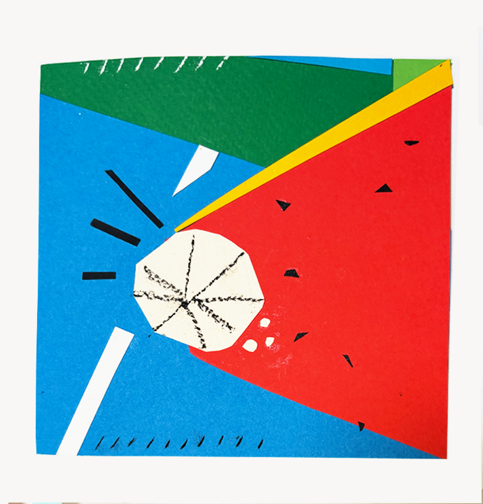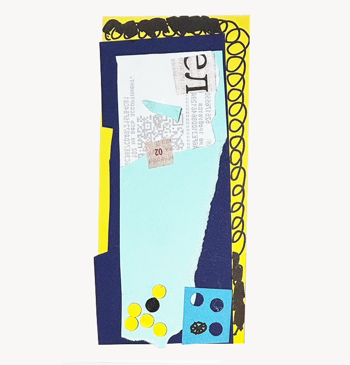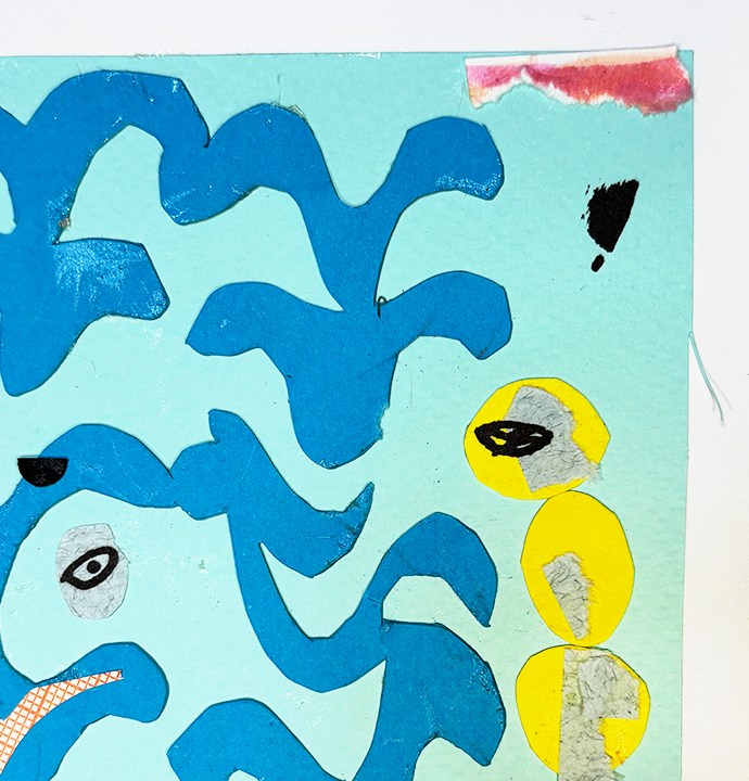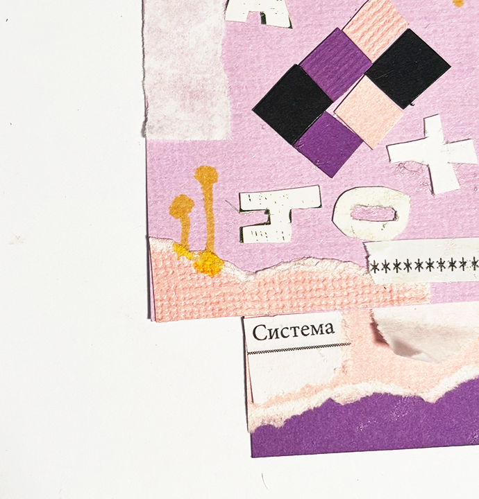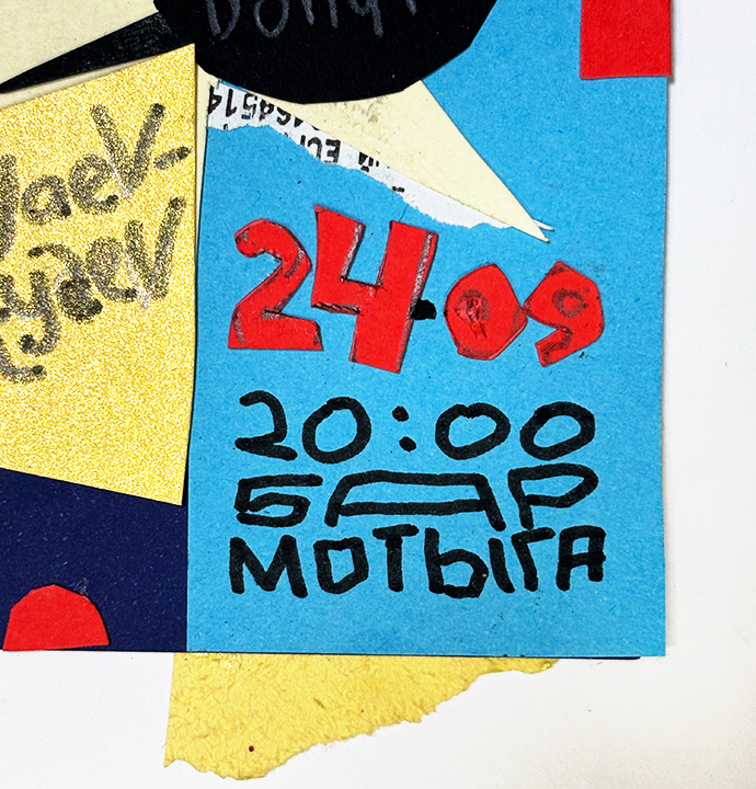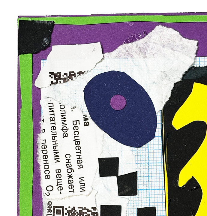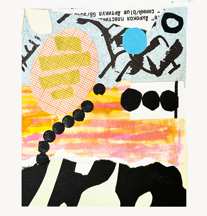 Бумага, мысль и неторопливое действие — так начинается работа. Скетчи фиксируют настроение и ритм, нащупывают форму и цвет. Перед аппликацией я настраиваюсь: слушаю эмоцию, выбираю силуэт и палитру. Под тихий хруст бумаги и рез ножниц примеряю решения, проверяю, как они держатся вместе. Из заготовок собираю композицию. Когда она устойчиво звучит — закрепляю клеем. Затем — финальные штрихи: маркер, пастель или чернила — то, что точнее подчёркивает характер. Останавливаюсь, когда форма и цвет входят в баланс.
