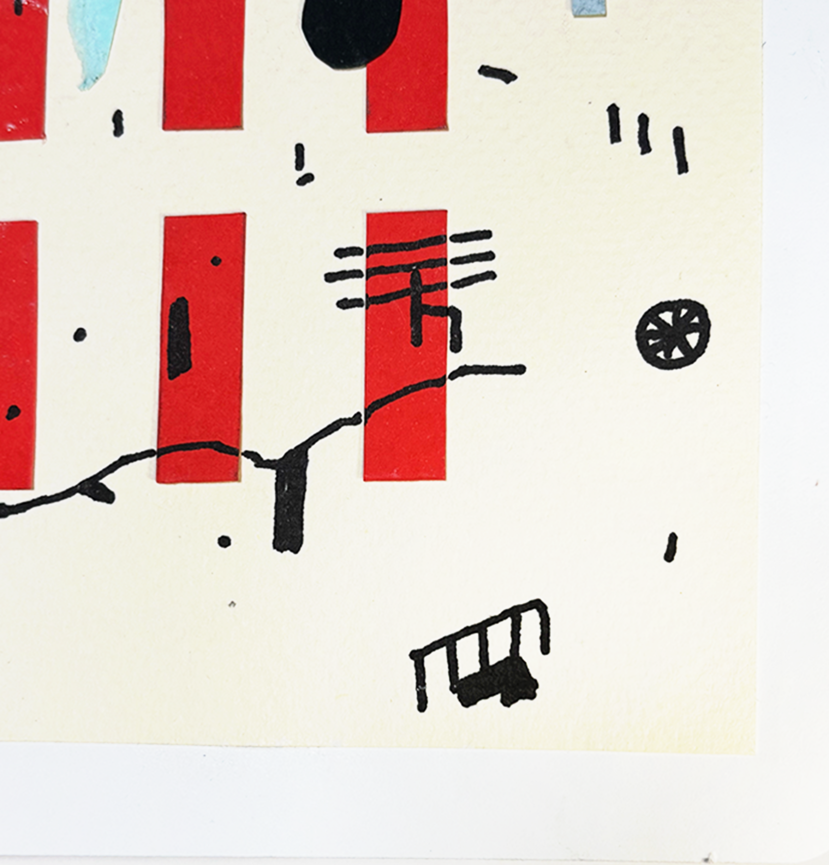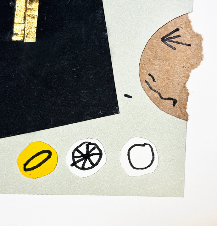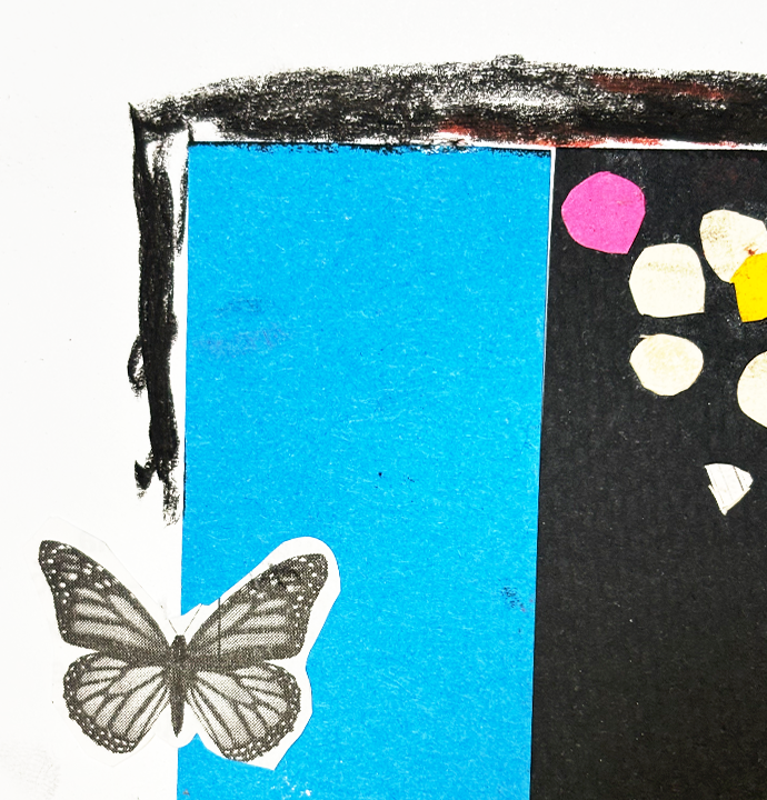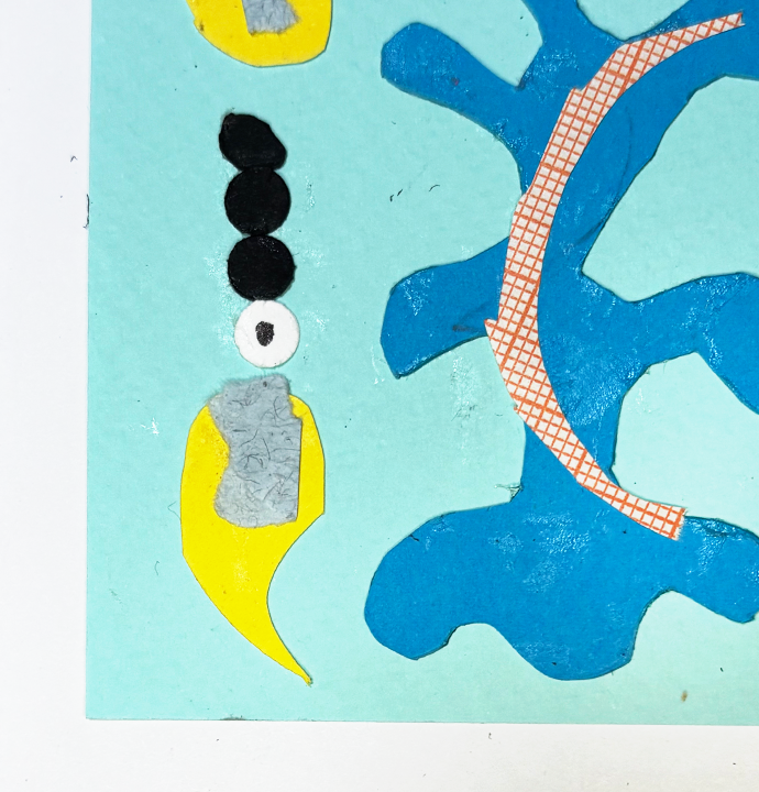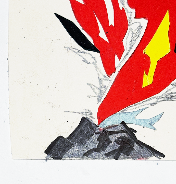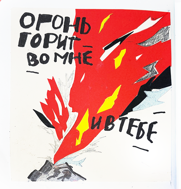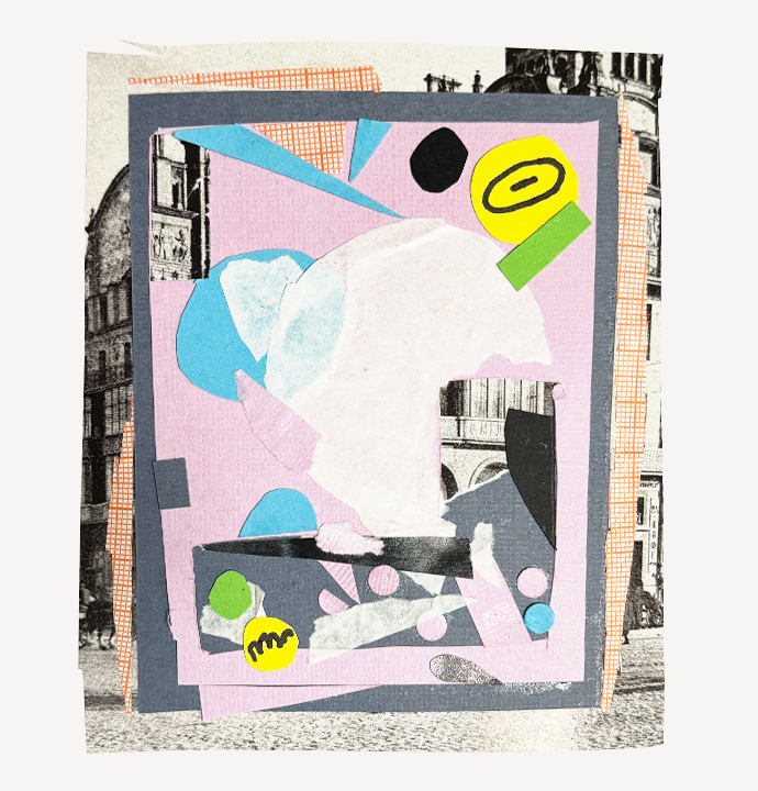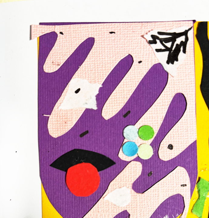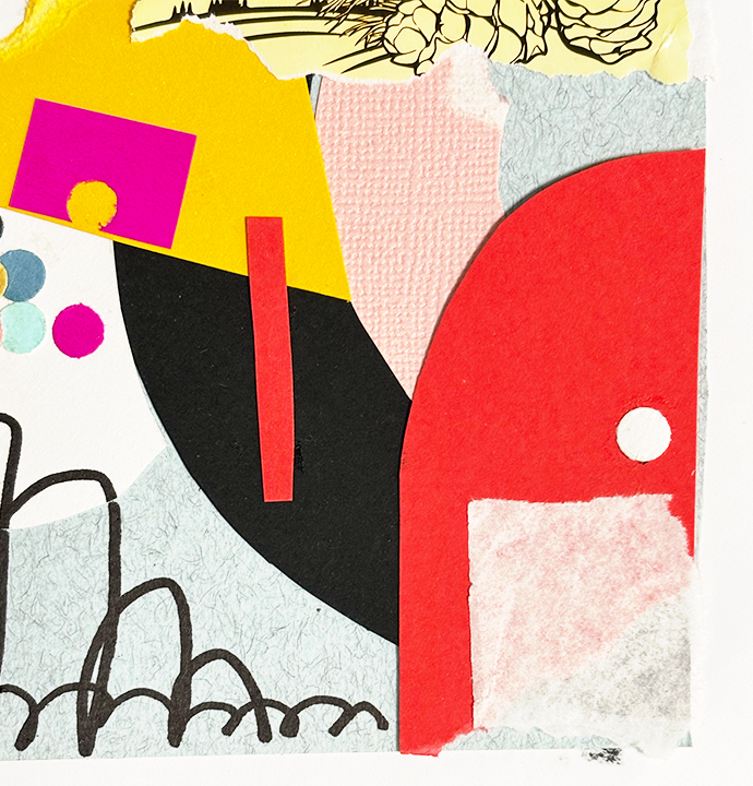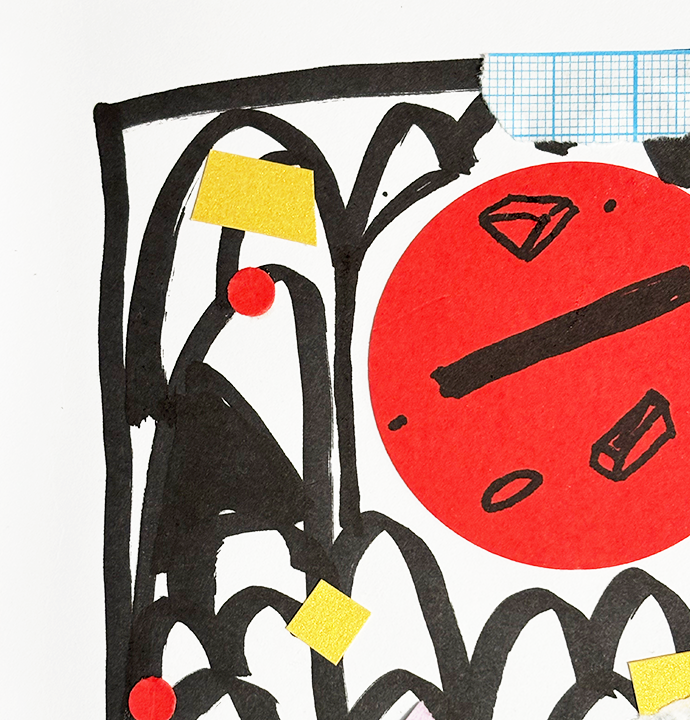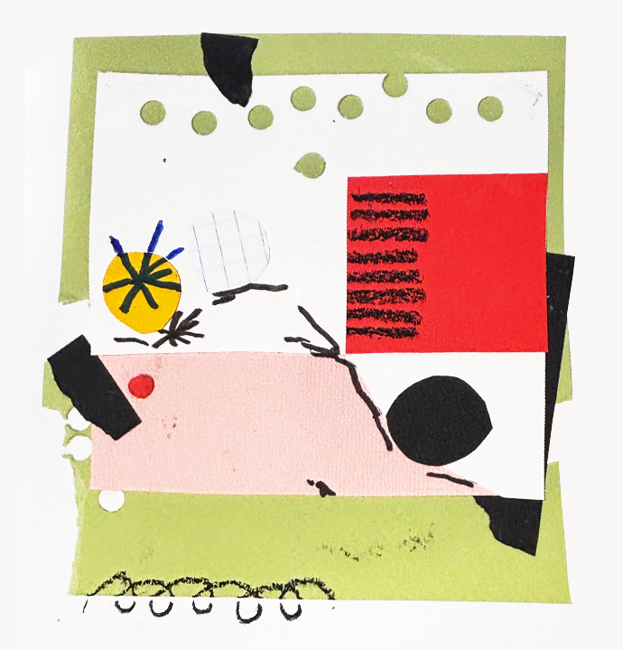Бумага, мысль и неторопливое действие — так начинается работа. Скетчи фиксируют настроение и ритм, нащупывают форму и цвет. Перед аппликацией я настраиваюсь: слушаю эмоцию, выбираю силуэт и палитру. Под тихий хруст бумаги и рез ножниц примеряю решения, проверяю, как они держатся вместе. Из заготовок собираю композицию. Когда она устойчиво звучит — закрепляю клеем. Затем — финальные штрихи: маркер, пастель или чернила — то, что точнее подчёркивает характер. Останавливаюсь, когда форма и цвет входят в баланс.