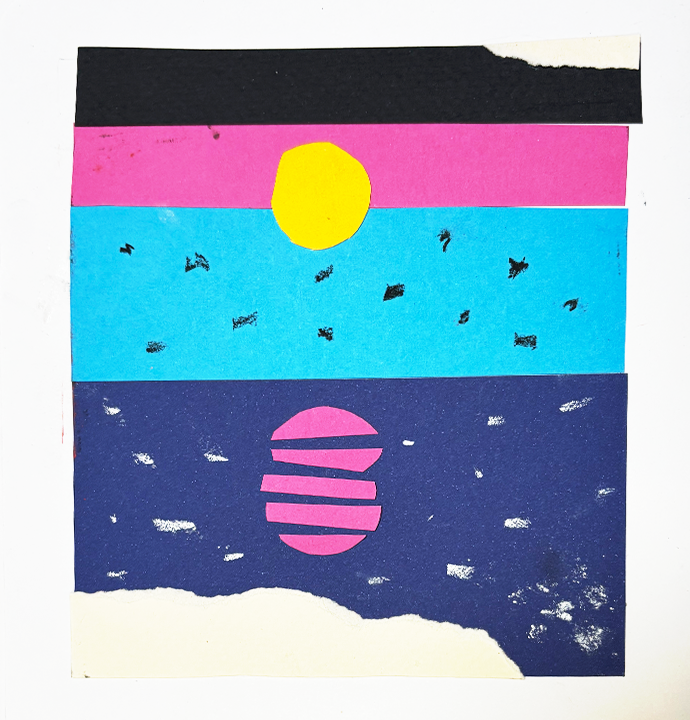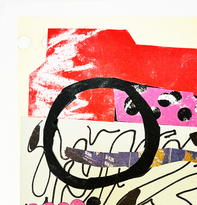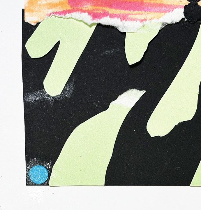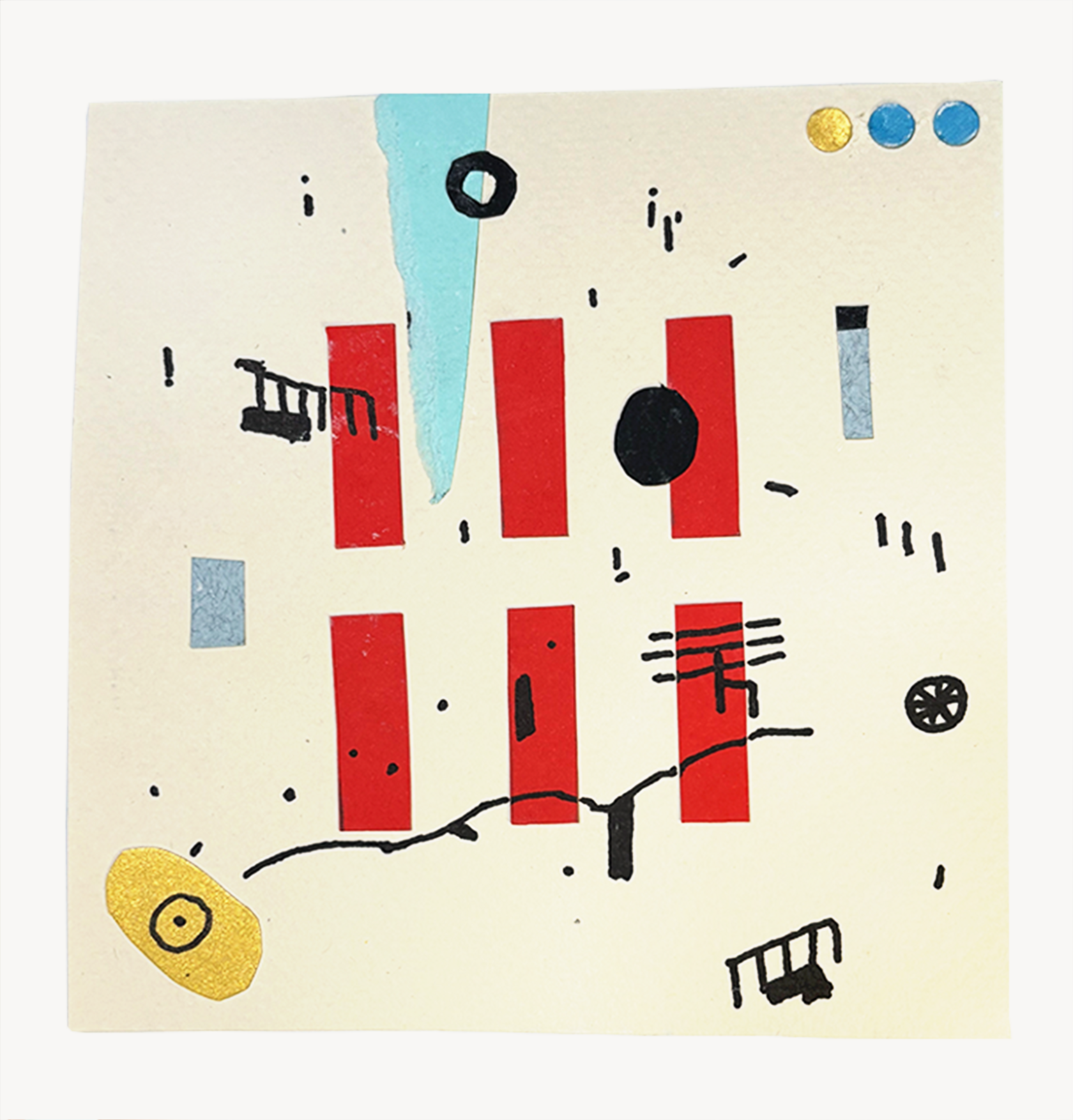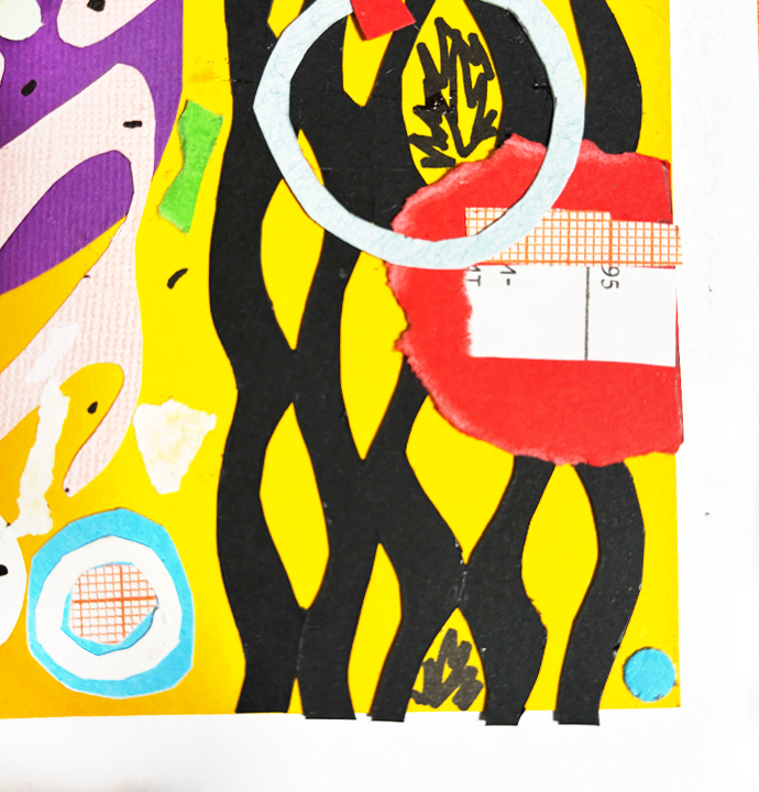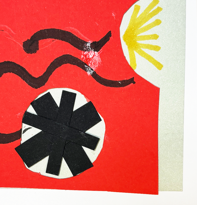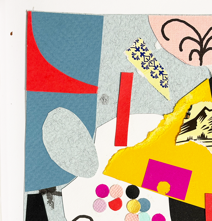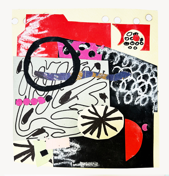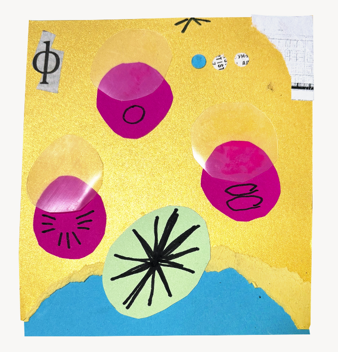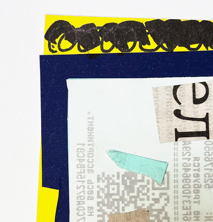 Бумага, мысль и неторопливое действие — так начинается работа. Скетчи фиксируют настроение и ритм, нащупывают форму и цвет. Перед аппликацией я настраиваюсь: слушаю эмоцию, выбираю силуэт и палитру. Под тихий хруст бумаги и рез ножниц примеряю решения, проверяю, как они держатся вместе. Из заготовок собираю композицию. Когда она устойчиво звучит — закрепляю клеем. Затем — финальные штрихи: маркер, пастель или чернила — то, что точнее подчёркивает характер. Останавливаюсь, когда форма и цвет входят в баланс.